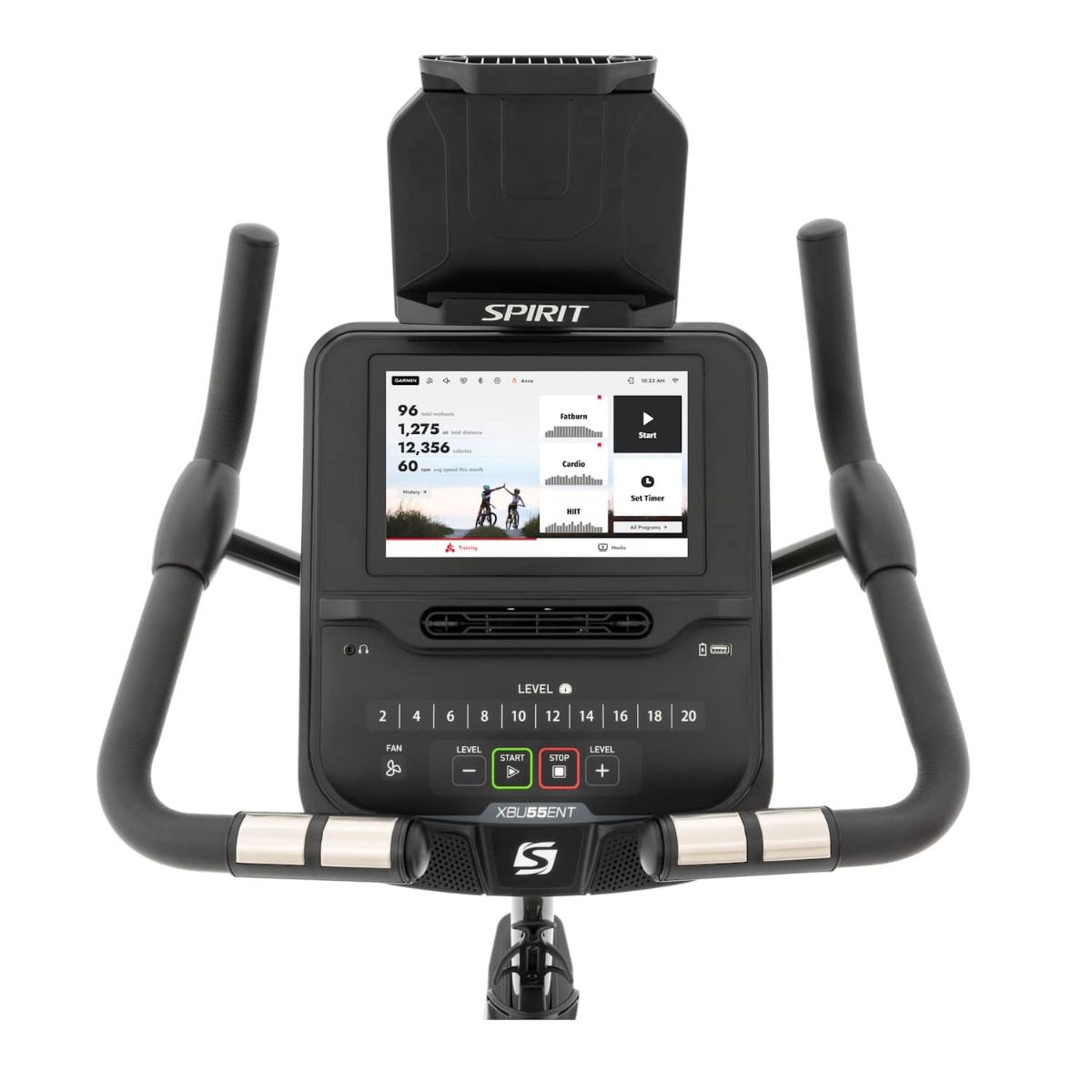 The Spirit SXBU55ENT Upright Bike (Entertainment Series) is designed to elevate your fitness routine with an immersive and interactive experience. Featuring an advanced 10.1” ClearView+™ touchscreen, you can easily navigate through a variety of training programs or enjoy preloaded apps like Netflix, YouTube, and CNN for endless entertainment options. Whether you're streaming your favorite shows or exploring virtual landscapes, the built-in screen mirroring and USB charging port keep you engaged and motivated throughout your workout.
