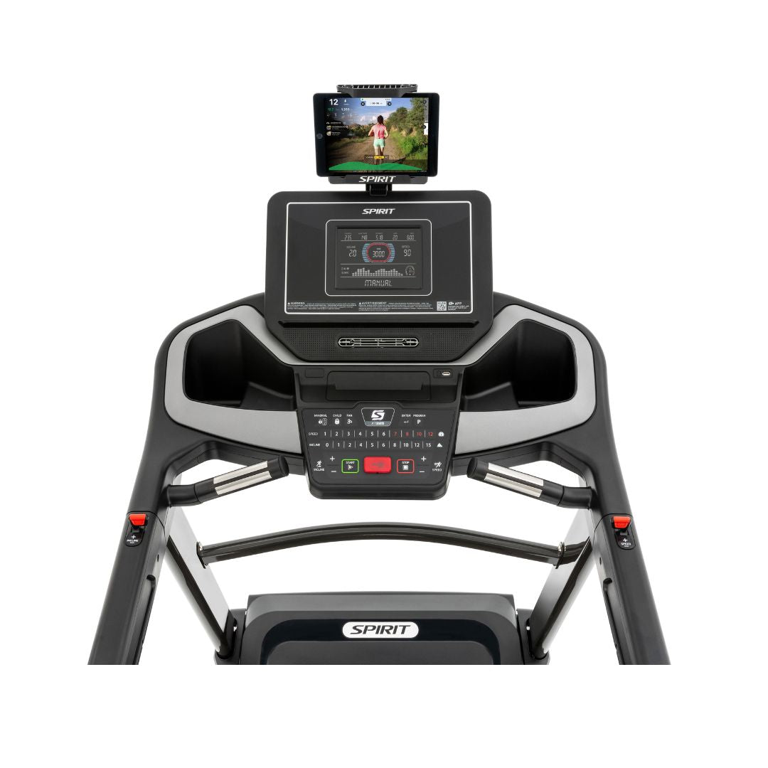 The Spirit SXT685V2 Treadmill is designed with your convenience in mind. The remote handlebar controls allow for quick and effortless adjustments to speed and incline, ensuring you can make changes on the go without interrupting your stride. Additionally, the treadmill includes an adjustable cooling fan to keep you comfortable, and a removable swivel-tilt tablet holder, perfect for entertainment or virtual classes without obstructing your view of the console data.